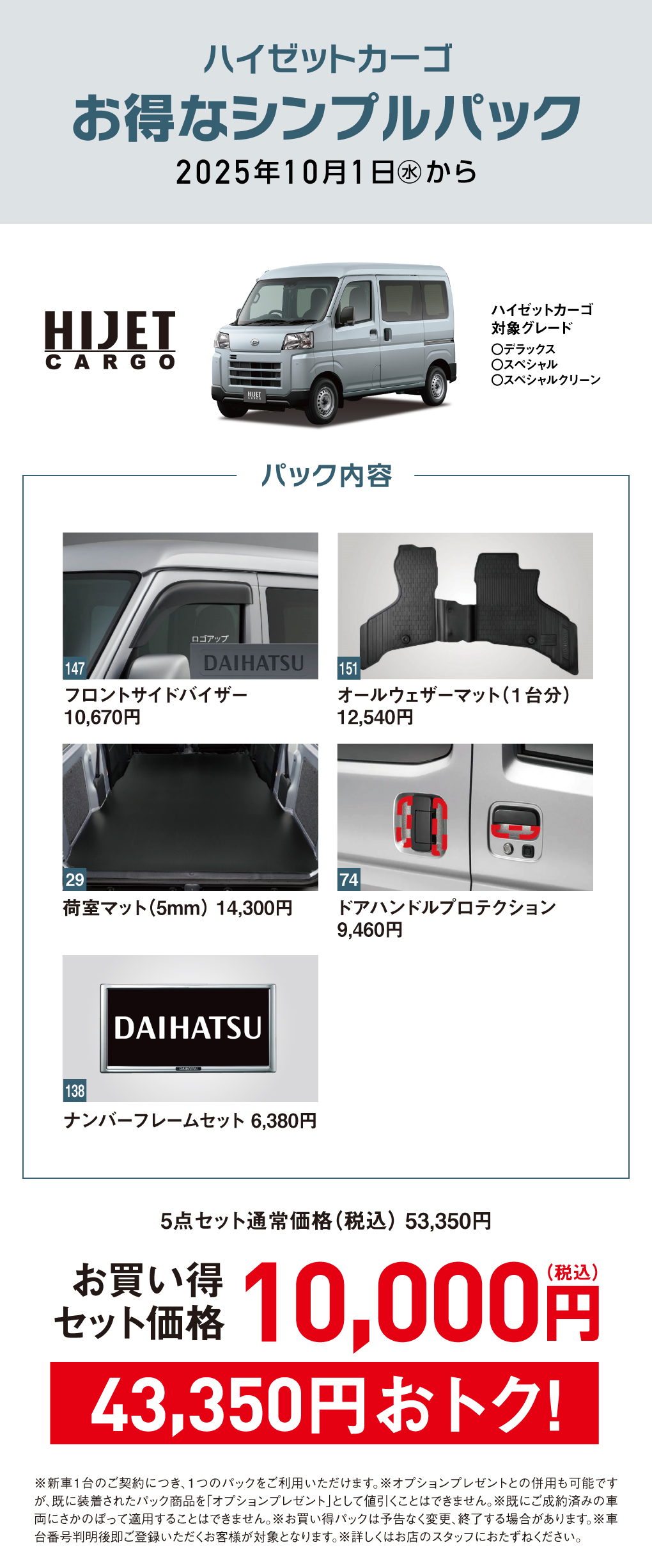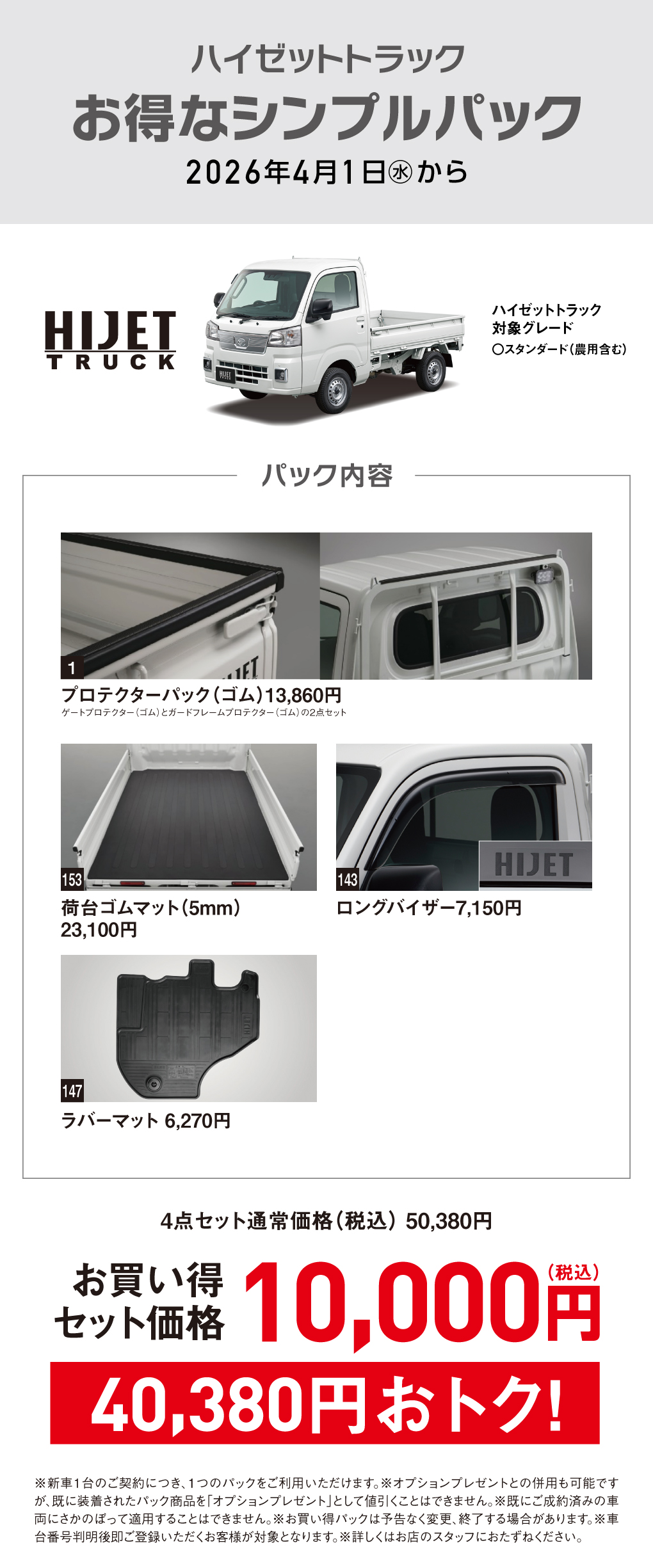 2026.04.01 お得情報 <石川ダイハツ限定>ハイゼットトラック・カーゴ お得なシンプルパック その他の最新情報 2026.04.01 お得情報 <石川ダイハツ限定>まるまるコーティングパック 2026.04.01 フェア・キャンペーン <石川ダイハツ限定>ハイゼットトラックワンプライス 2026.04.01 お得情報 <石川ダイハツ限定>お買い得パック!
